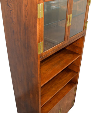 This wonderful Campaign display case by Henredon in the Scene One line is perfect for display and storage in your living room, office or library. Mirror-backed upper display area has an adjustable height glass shelf. Middle space has an electrical outlet and adjustable shelving. Lower section behind cabinet doors has adjustable height wooden shelving. The glass on the door panels is beveled. The cabinet top has recessed lighting. Flush mounted campaign brass handles throughout.