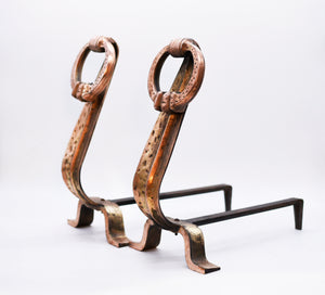 Accessorize your fireplace with this pair of handsome heavy vintage bronze andirons. The ring and leaf design gives them a sophisticated, rich look. Stamped "Japan".