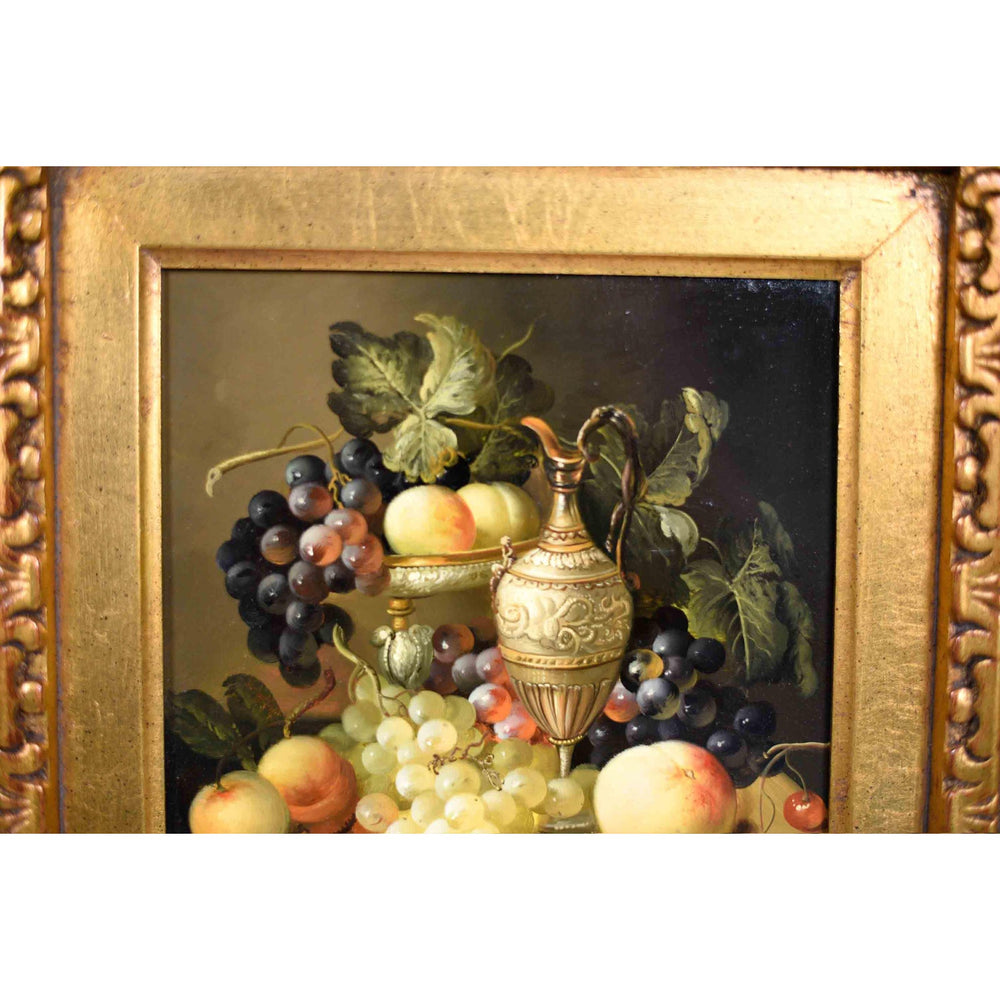 Vintage Still Life Oil on Board Grapes Peach Carafe Painting in Gilt Frame Signed
